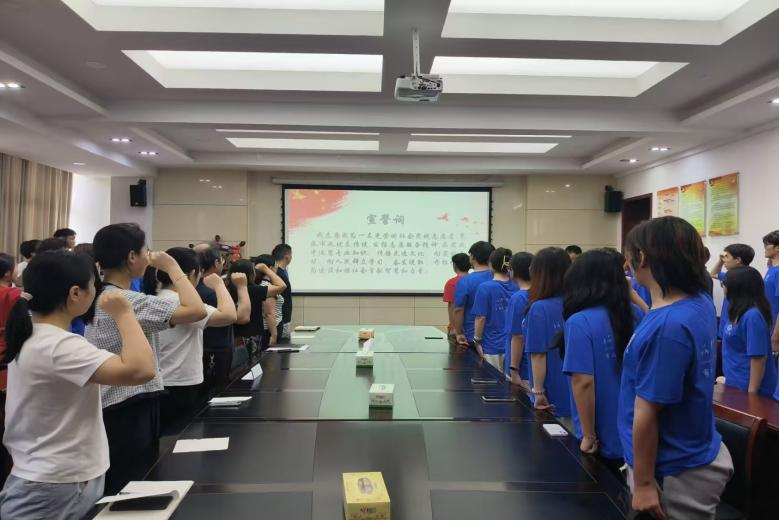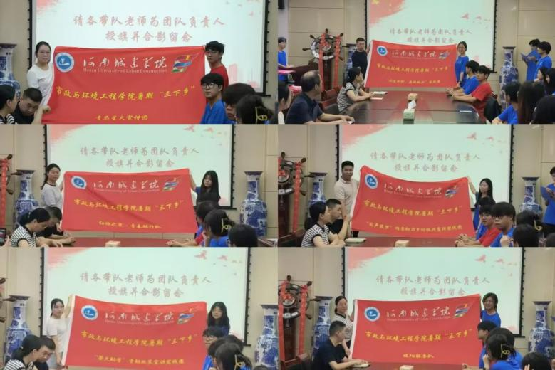 我院青年志愿者代表于缘基带领全体学生宣誓,指导老师为各团队授旗并合影留念。