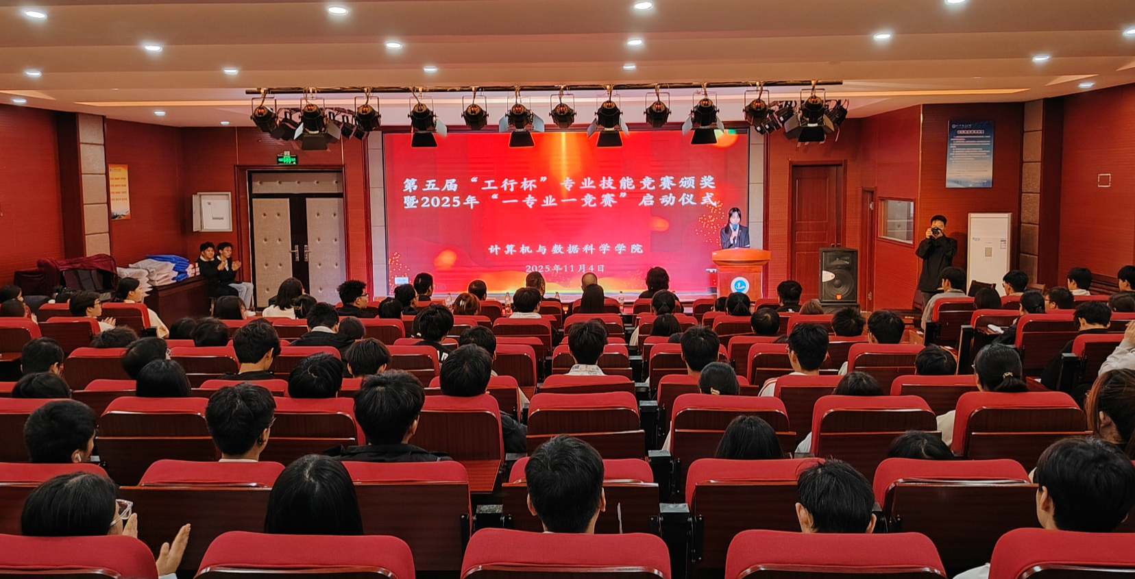 (通讯员 任恒)金秋硕果,丹桂飘香。11月4日,计算机与数据科学学院在四号楼音乐教室举行第五届“工行杯”专业技能竞赛颁奖典礼暨2025年秋季学期“一专业一竞赛”赛事启动仪式。学院院长赵军民、副院长张凯,智慧规划与智慧校园研究中心主任魏新红出席颁奖仪式,全体辅导员、优秀指导老师代表及150余名学生代表参与本次仪式。